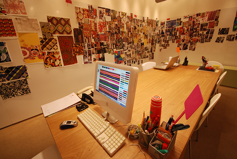 Criar o projeto da La Estampa foi como mergulhar numa cartela de cores. Após atravessar uma tímida portinha, o cliente é recebido em uma confortável recepção. Percorrendo um corredor “amarelo”, que é o eixo central do escritório, é possível chegar aos showrooms e a sala de criação, que valorizam a permanência e o conforto.