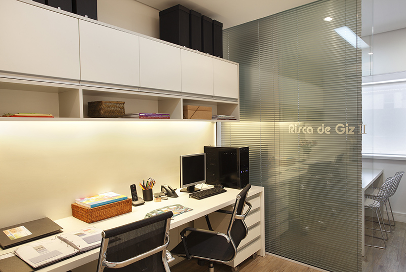 Todos os ambientes de trabalho foram integrados, exceto a sala da sócia da empresa. A divisão deste espaço foi executada em vidro temperado para permitir que a iluminação externa pudesse entrar em todo o escritório.