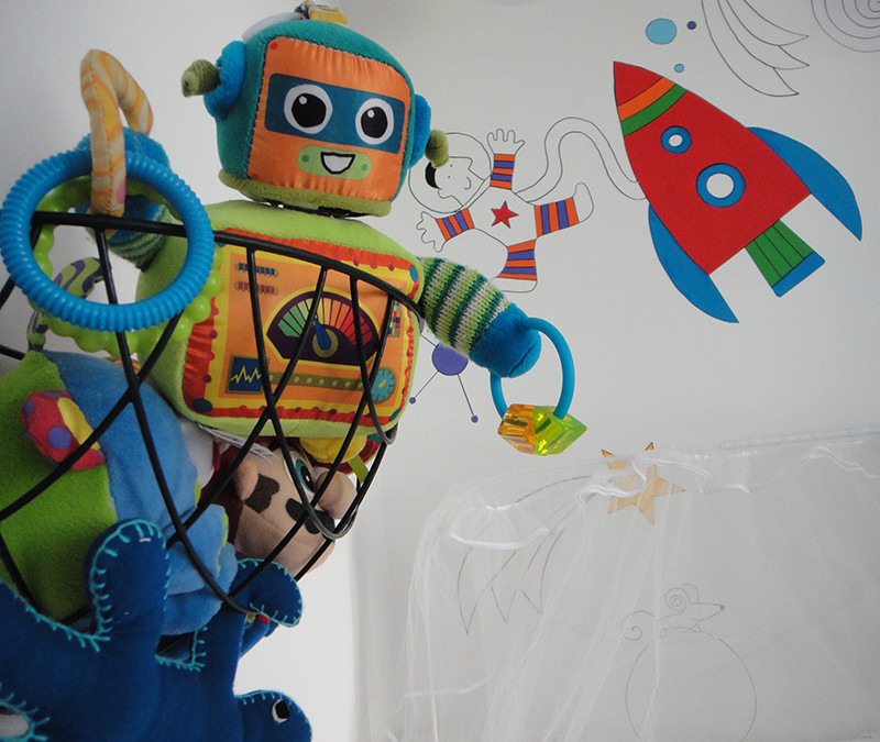Todos os desenhos foram pintados à mão com traços simples.  A composição interplanetária recebeu móveis com linhas retas e alguns objetos foram usados com nova função, como os cestinhos para plantas que viraram charmosos organizadores para os brinquedos.