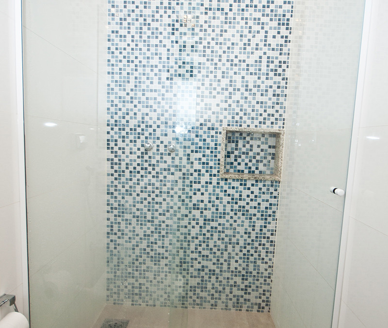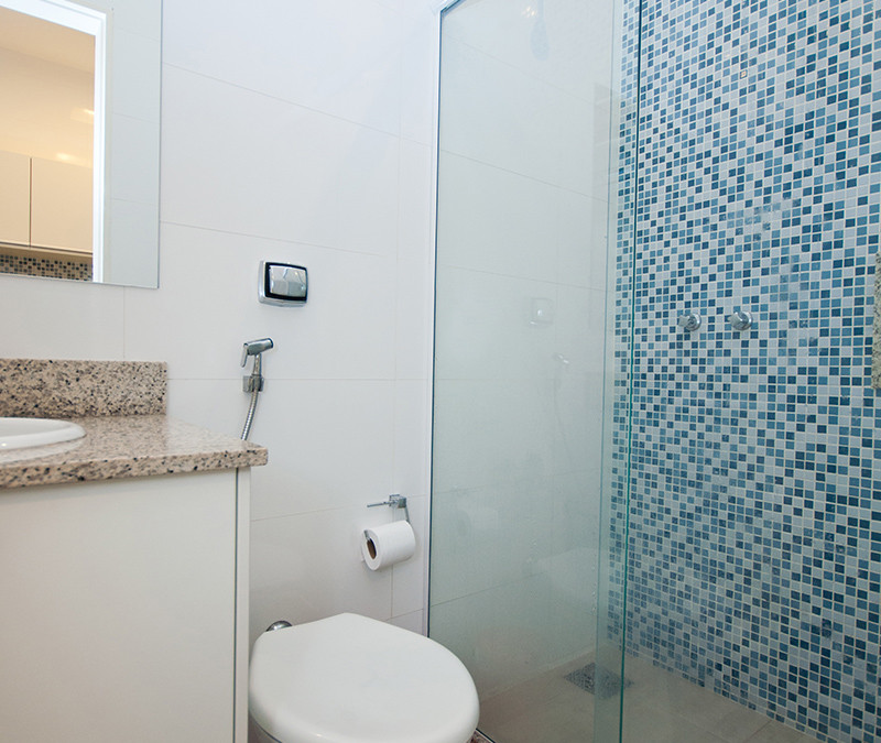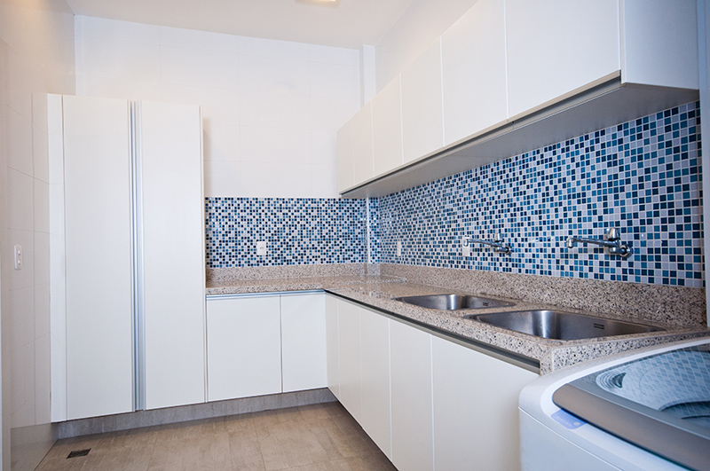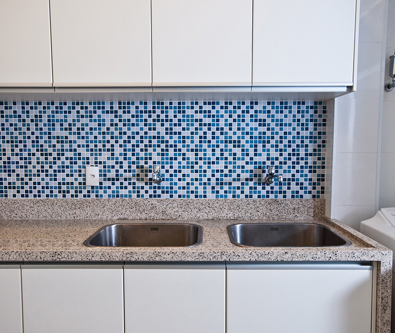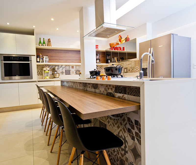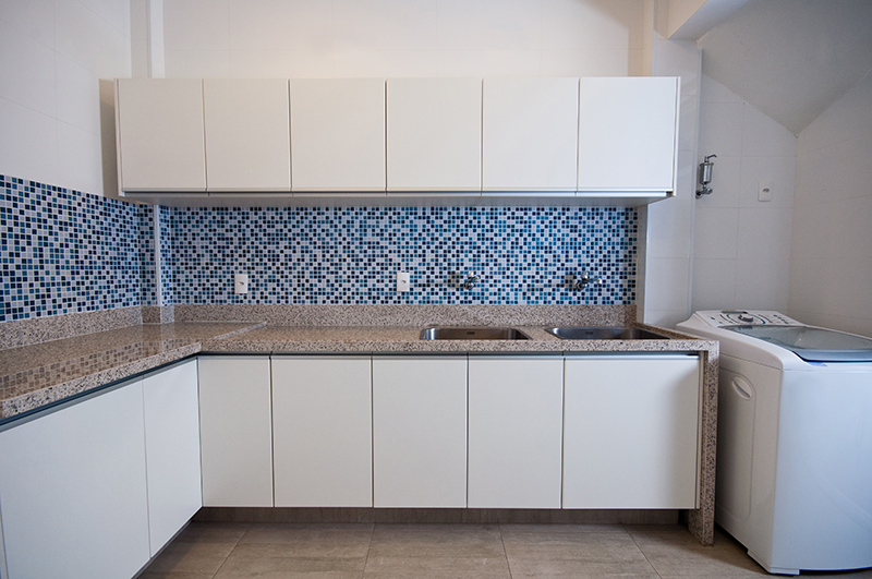 Os materiais escolhidos (silestone branco norte, porcelanato, cerâmica, espelho, madeira e fórmica branca) são nobres, resistentes para o uso intenso do ambiente e práticos no dia a dia. As paredes acima das bancadas foi revestida em patchwork de azulejos com textura similar aos ladrilhos hidráulicos equilibrando a transição dos detalhes coloniais com a configuração moderna do ambiente.