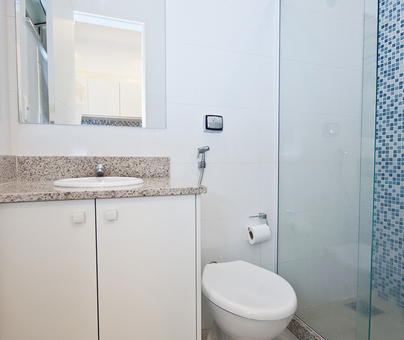 Os móveis projetados foram executados pela Florense. A madeira sintética trouxe equilíbrio entre as grandes áreas neutras (piso e grande parte das portas dos armários) que somado aos detalhes em espelho trouxe sofisticação e personalidade ao ambiente. A composição entre armários prateleiras deixou o ambiente leve e com espaços suficientes de armazenagem.