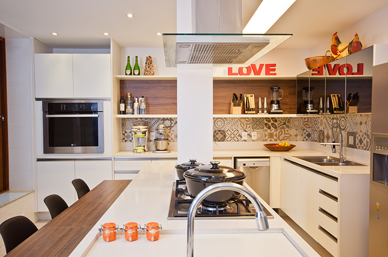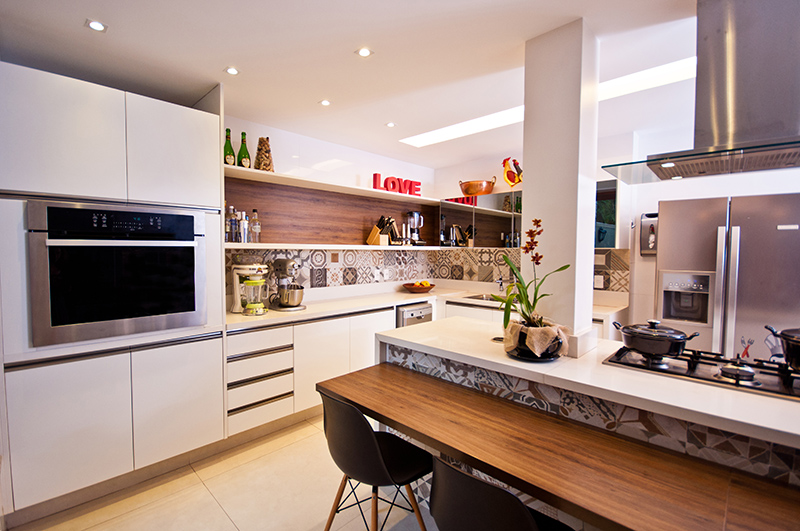 A distribuição mais eficiente ampliou o espaço destinado para a cozinha, que ficou com cerca de 30m2, o que permitiu a instalação de uma ilha central com cooktop e cuba de lavagem e paralelo um balcão em madeira onde é possível a participação de quem estiver presente integrando totalmente o espaço e deixando mais divertido.