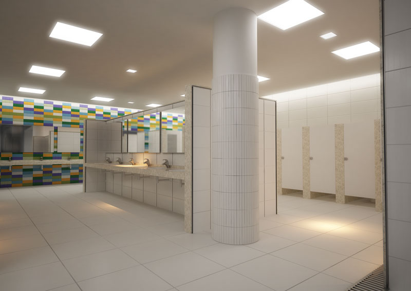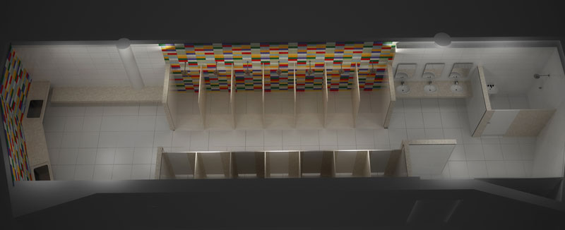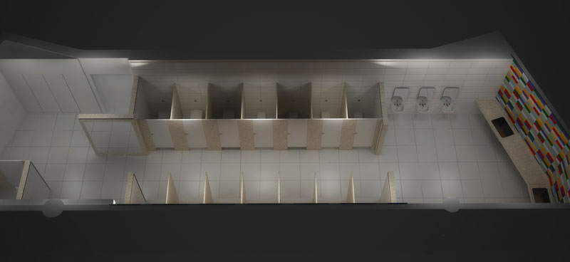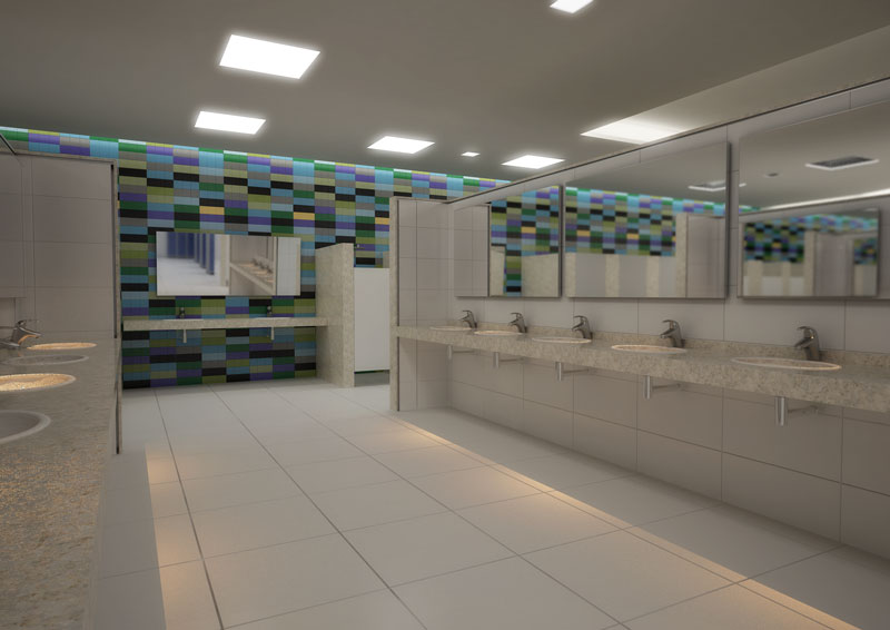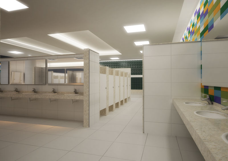 A iluminação natural existente nas áreas das duchas foi preservada. Já nas áreas das bancadas foi utilizada iluminação especial.