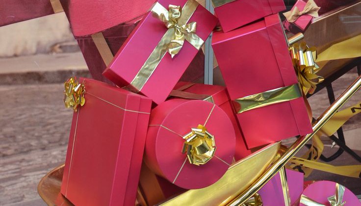 E porque não montar uma vitrine com muitos presentes, tantos que o cliente precisaria de um carrinho de mão para carrega-los? É exatamente o que sugere esta composição elegante em dourado e pink desta loja.